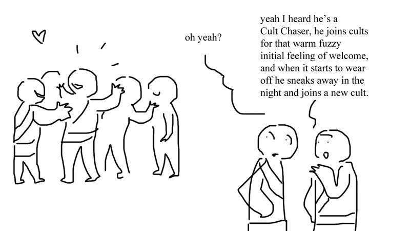 Well, I was on the periphery. Without going into too much detail, it was a nerd drama so extreme that there are several hours of youtube devoted to it. It was a group of people who thought you could marry anime characters by writing fanfic about them and thinking about them REALLY HARD. My best college friend was very deeply into this, and then she fell in with an extra culty, very online Svengali and compulsive liar, very much a recurring type of the sort featured on the BLOCKED AND REPORTED podcast.1 She would influence lonely college kids by acting as a sort of anime boyfriend facilitator.